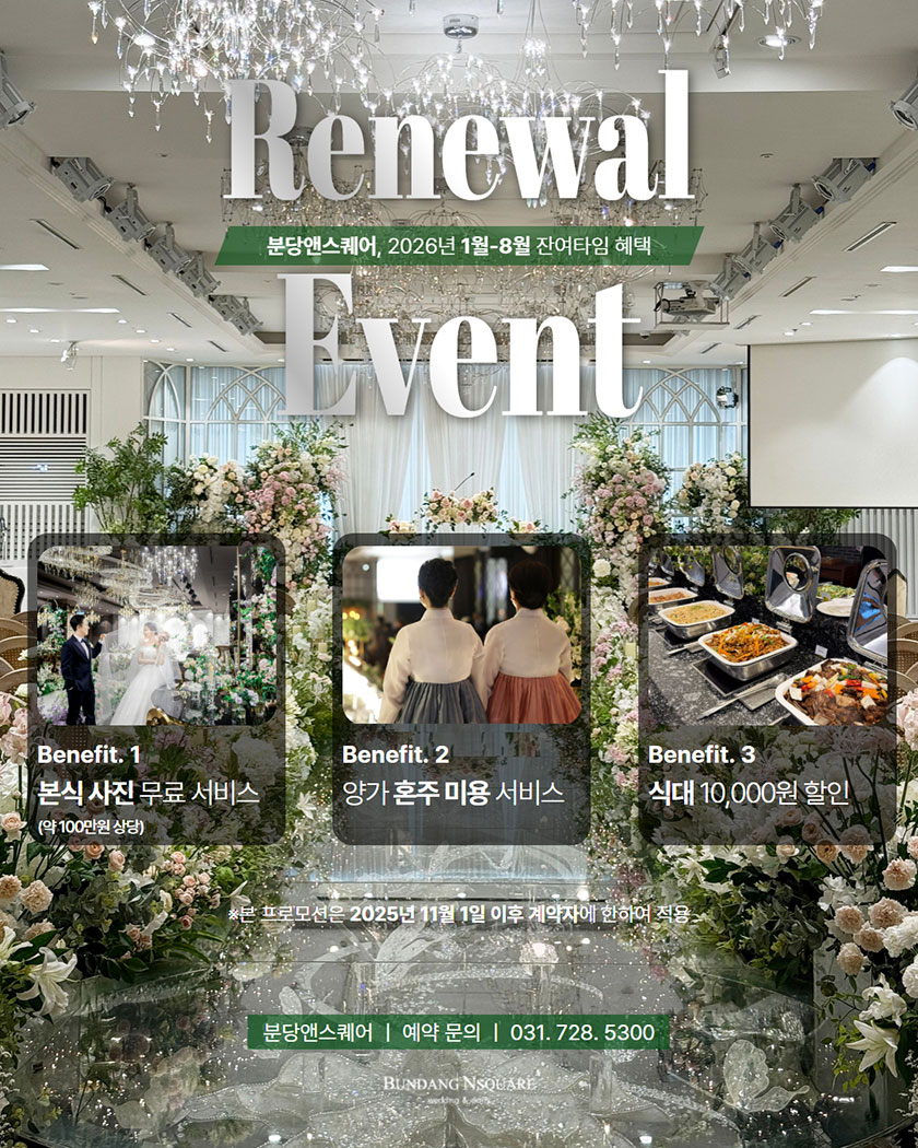 이벤트 상세 혜택 2026년 1월~8월 잔여타임 프로모션 분당앤스퀘어 리뉴얼 기념 2026년 1월~8월 웨딩 잔여 스페셜 혜택 이벤트 기간 : 2025/11/01 ~ 계속 TEL : 031-728-5300 이벤트 혜택 자세한 사항은 예약실로 문의주세요.대표 전화 031-728-5300 이벤트 기간 2025/11/01 ~ 계속 이벤트 조건 ※ 25년 11월 1일이후 신규 계약자에 한함 목록 이전 이벤트 대기시간 없는 사전 상담 예약 다음 이벤트 다음 이벤트가 없습니다.